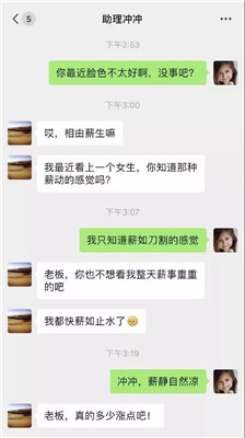 前倆天,岳云鵬在微博上曬出和助理沖沖的聊天記錄,并配文:“下午跟沖沖掏了薪窩子。”助理想要漲工資,說自己“薪事重重、薪如止水”,而岳云鵬則回復(fù)說“薪靜自然涼”。