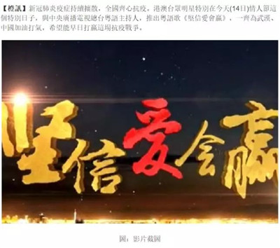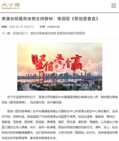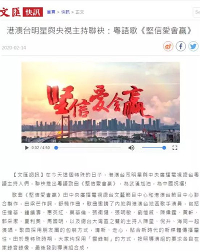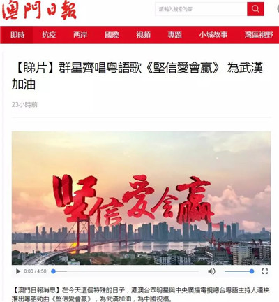 近日,由中央廣播電視總臺制作,中央廣播電視總臺粵語主持人聯(lián)合港澳臺眾明星聯(lián)袂演唱的抗擊疫情歌曲《堅(jiān)信愛會贏》粵語版在港澳地區(qū)熱播,歌曲引發(fā)港澳民眾熱烈反響,鼓勵人們齊心協(xié)力共同戰(zhàn)勝疫情。