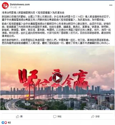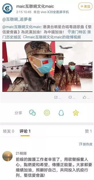 香港市民陳志豪對記者表示,中央廣播電視總臺制作了這首激勵人心的粵語版歌曲,對香港人和澳門人來說特別有親切感!案枨鷤鬟f出齊心協(xié)力、共同抗擊疫情的決心與意志及催人奮進(jìn)的力量!卑拈T中華新青年協(xié)會負(fù)責(zé)人林晨看了歌曲的視頻覺得備受鼓舞,他相信中國人經(jīng)過齊心協(xié)力,一定能夠戰(zhàn)勝疫情。網(wǎng)友“21朝陽”在澳門互聯(lián)網(wǎng)文化協(xié)會的社交媒體上留言表示:前線醫(yī)護(hù)工作者辛苦了,用歌聲振奮人心,點(diǎn)燃愛和希望,傳播正能量。大家都要繼續(xù)加油,照顧好自己,共同投入抗疫行列,堅(jiān)信愛會贏!網(wǎng)友Lusu留言說:眾志成城,武漢加油,中國必勝!