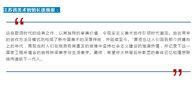 主題性經(jīng)典典藏大家名作、時(shí)代情景復(fù)原,有生氣,接地氣,“‘大橋記憶’顯然是對(duì)主旋律美術(shù)策展的一次有益探索和嘗試!斑@類(lèi)展覽要避免教科書(shū)式的說(shuō)教,自覺(jué)走近群眾,用生活化細(xì)節(jié)打動(dòng)人,用接地氣的故事抒發(fā)情懷,力爭(zhēng)作品真實(shí)、好看、動(dòng)情,引發(fā)與觀眾的共鳴。”