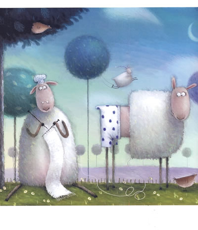 我得數(shù)羊,全世界的人睡不著都得數(shù)羊,所以我這只睡不著的羊也得數(shù)羊。媽媽們總是這樣說。 于是,羅素?cái)?shù)起羊來,他數(shù)了戴假牙的羊奶奶,數(shù)了抱小熊的羊姐姐,數(shù)了睡得很乖的羊三兄弟,數(shù)了蓋圓圈被子的羊哥哥,數(shù)了正在做美夢的羊爸爸羊媽媽,數(shù)了穿睡褲的羊爺爺。一只羊,兩只羊,三只羊??九只羊。身邊的羊都數(shù)光了,可是,還是沒睡著。羅素想啊想,是不是哪只羊忘記數(shù)了呢?