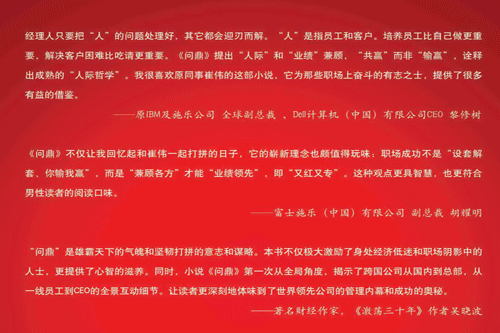 外企職場是大漩渦,身在其中的人都不可避免。但如果總是站在自己的立場上看問題、想策略,無疑,這樣的職場人走不到更高處。之所以小說命名為《問鼎》,是希望教會大家普世性的道理和原則,如果能學(xué)習(xí)吸收并且善于利用這些方法策略,也許職場道路就不會只有輸贏,總要浮沉,就不會總中圈套,這是作者在此書中希望達到的目的。