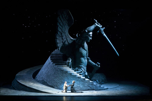 其后,舞臺進入了全劇的高潮,第二幕和第三幕之間出現(xiàn)了一次完全沒有幕間休息的換景。傾斜的宮殿伴隨著斯卡皮亞的死亡沉入地下,同時一座手持長劍、雙翅展開的巨型天使像呈現(xiàn)在舞臺后方,如電影鏡頭般的徐徐從舞臺后方向前推進。雖然演員還未開口演唱,為完成這一場景轉換,國家大劇院舞臺技術部門也面臨著比以往更多考驗。巨大的天使高度近8米,利用的舞臺縱深也多達近50米。盡管每天國家大劇院每天都有一流的演出,但這種獨特的舞美結構和無縫銜接的轉換方式還是頭一次。