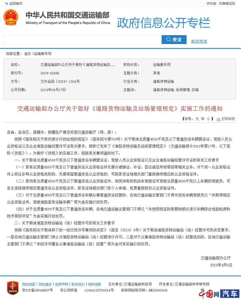 中國網汽車9月24日訊 根據我網記者獲悉,近日,交通運輸部辦公廳發(fā)布了《關于做好道路貨物運輸及站場管理規(guī)定實施工作》的通知,明確了取消“雙證”以及企業(yè)道路運輸經營許可證、取消道路貨物運輸站(場)經營許可的有關工作要求。