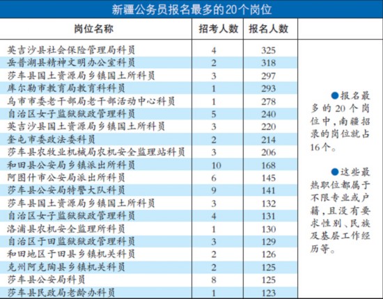3月29日是新疆公務(wù)員考試報名的最后一天,當(dāng)天公務(wù)員報名人數(shù)最多的前20個崗位公布,南疆招錄的崗位就占16個。競爭最激烈的崗位是庫爾勒市教育局科員一職,報名293人只招錄1人。目前還有512個繳費零空缺職位。