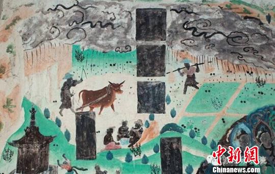 莫高窟第23窟北壁畫面上烏云迷漫,細(xì)雨瀝瀝,一位農(nóng)夫揮鞭策牛耕地,一位農(nóng)夫肩挑莊稼!《鼗脱芯吭禾峁z