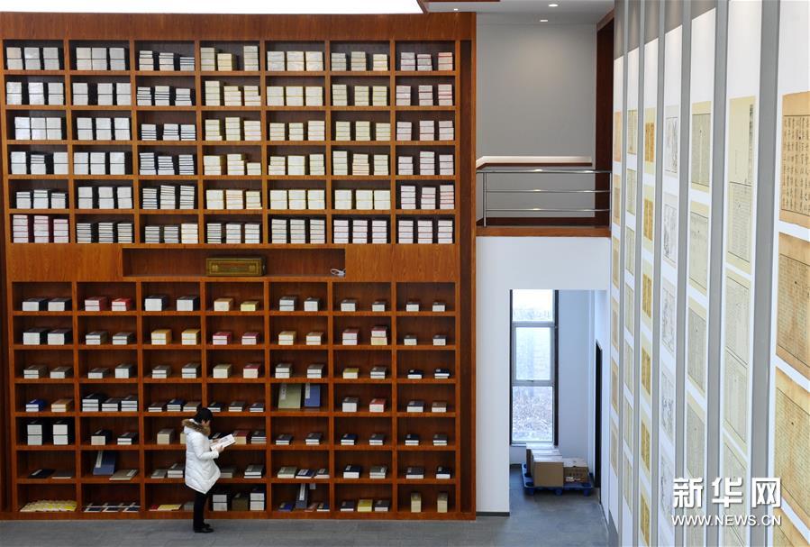 12月13日,參觀者在河北吳橋金鼎古籍印刷廠展室內(nèi)翻閱線裝書。