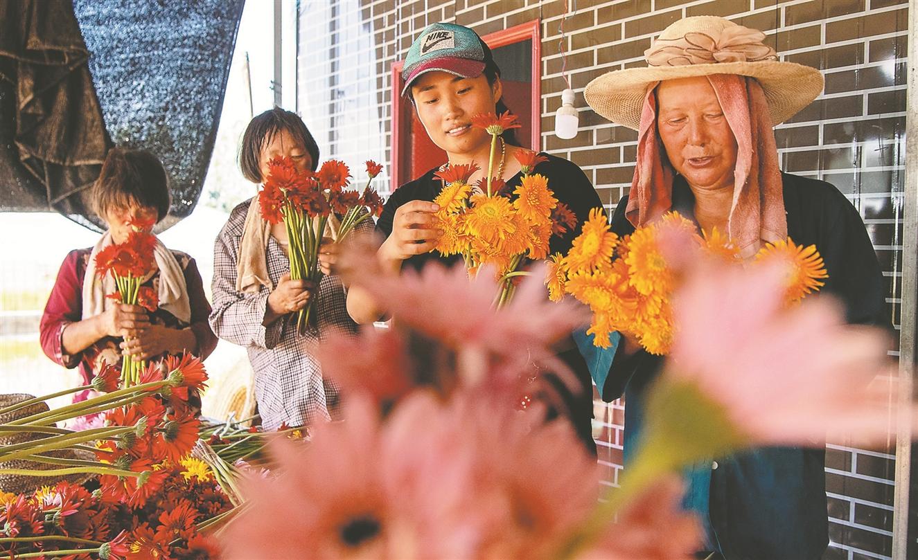 8月15日,在花卉基地務(wù)工的農(nóng)戶忙著打包鮮花,及時(shí)發(fā)往合肥和上海市場(chǎng)。