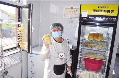 沙日格臺(tái)嘎查村民佟雙節(jié)展示自己制作的奶制品。