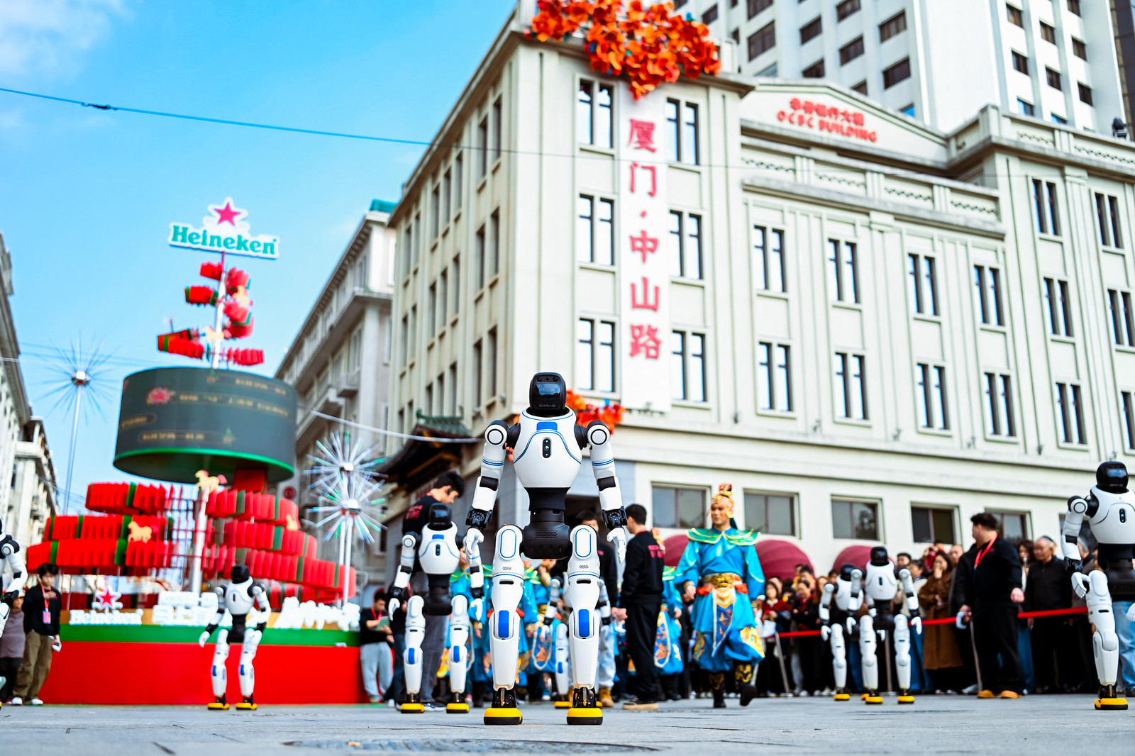 2月18日,兩岸數(shù)智非遺主題秀《科技藝陣》在廈門(mén)中山路首秀。來(lái)自臺(tái)灣彰化的蝌蚪打擊樂(lè)團(tuán)、廈門(mén)與金門(mén)的宋江陣團(tuán)體及何厝小操隊(duì),攜手機(jī)器人“旺來(lái)”藝術(shù)團(tuán),共同呈現(xiàn)人機(jī)“同臺(tái)共舞、同陣共演”的科技盛宴。