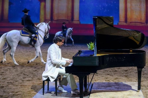 歐洲古典馬術(shù)是現(xiàn)代馬術(shù)運動的起源之一。在馬術(shù)秀上,來自安太谷團隊的西班牙古典馬術(shù)表演騎手就為觀眾展示了“學院派”古典馬術(shù)表演。騎手們畢業(yè)于世界四大古典馬術(shù)學院之一的安達盧西亞皇家馬術(shù)藝術(shù)學院,他們騎乘西班牙馬種安達盧西亞馬走起舞步,身著以藍顏色為主的宮廷服飾,彰顯西班牙的傳統(tǒng)古典馬術(shù)歷史的傳承。同時,西班牙著名鋼琴家馬諾洛·卡拉斯科為表演團隊傾情伴奏。他曾任安達盧西亞皇家馬術(shù)藝術(shù)學院的音樂作曲人,為每個馬術(shù)動作譜寫和諧動人的鋼琴旋律。