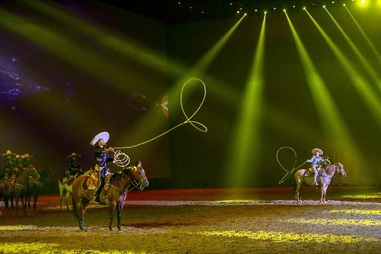 墨西哥的傳統(tǒng)騎術(shù)“Charrería沙雷里亞”屬于墨西哥中西部牛仔競技中的一種形式,且在2016年,正式被聯(lián)合國教科文組織列入人類非物質(zhì)文化遺產(chǎn)名錄。在“世界傳統(tǒng)馴馬大會”馬術(shù)秀,墨西哥牛仔表演團隊第一次來到中國,向中國觀眾展示墨西哥人的馬文化“活歷史”。演出中,6名墨西哥女騎手騎乘側(cè)鞍騎馬走隊形,墨西哥男性騎手手持套索,展示國民傳統(tǒng)馬背運動的精髓。