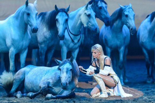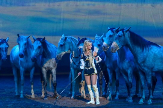 來自于烏克蘭的美女騎手安娜(Bashenko Anna)帶領(lǐng)8匹安達盧西亞馬展示自然馴馬法。充滿靈性的馬兒圍繞著一位精靈般的女孩,將“人馬合一,心意相通”的馴馬和特技表演。屏幕上呈現(xiàn)的是深藍色的海洋,唯美的音樂和背景、曼妙的身姿、溫順的馬群,浪漫的風格是這場馬秀的點睛之筆。