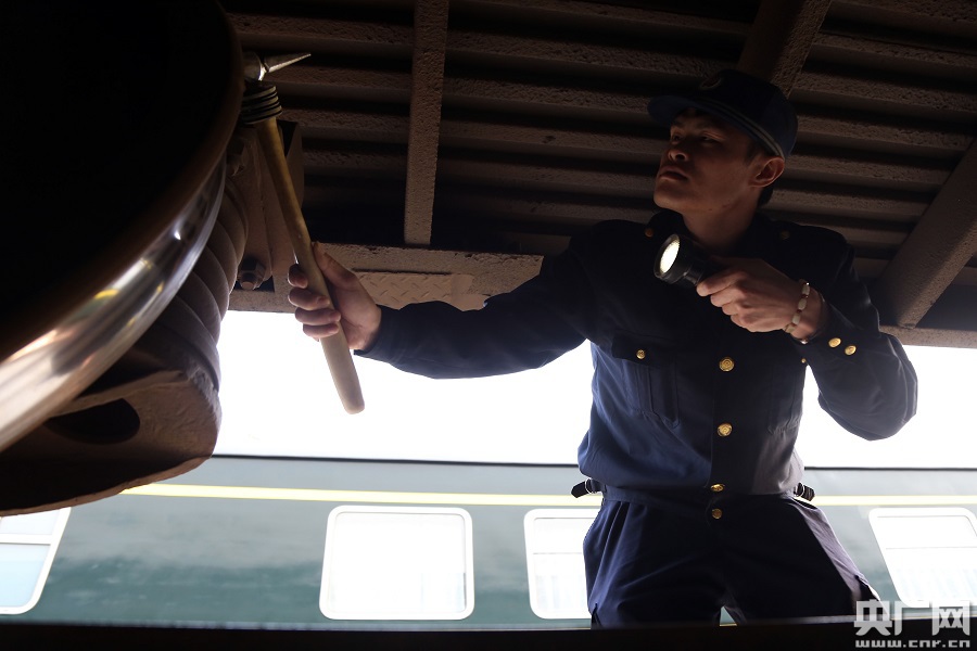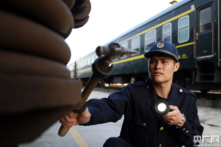 “車輛醫(yī)生”用檢車錘加強客車走行部檢查(央廣網(wǎng)發(fā) 王玉星 攝)
