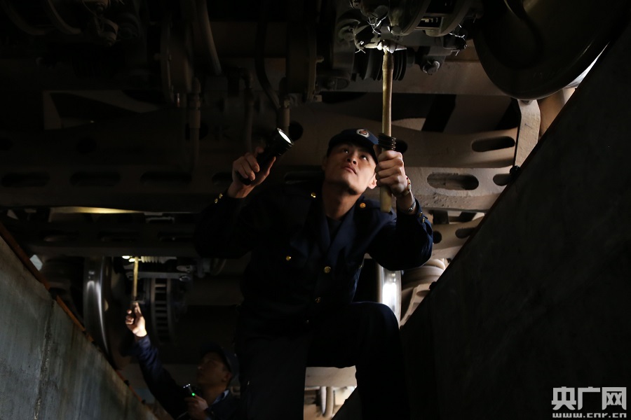 “車輛醫(yī)生”在列車底部對懸吊裝置進行檢查(央廣網(wǎng)發(fā) 王玉星 攝)