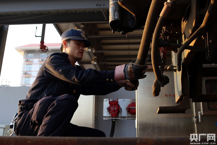“車輛醫(yī)生”在對列車車鉤進行檢查(央廣網(wǎng)發(fā) 王玉星 攝)