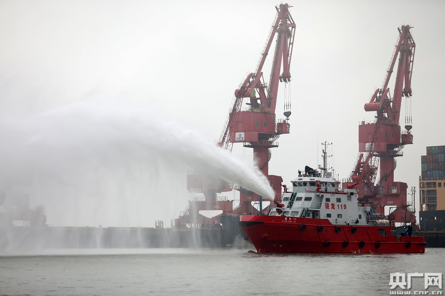 驍龍119號消防船在演練滅火作業(yè)(央廣網(wǎng)發(fā) 通訊員供圖)