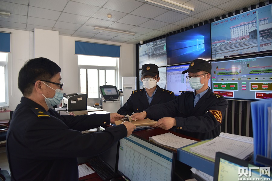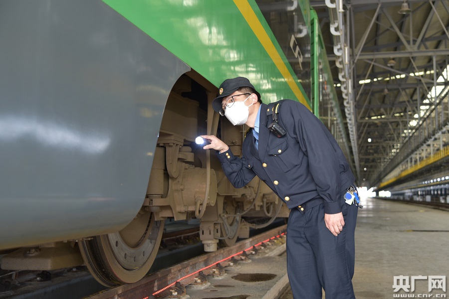 出庫前,馮良良對列車進行檢查,確保其狀態(tài)良好(央廣網(wǎng)發(fā) 戴志強 攝)