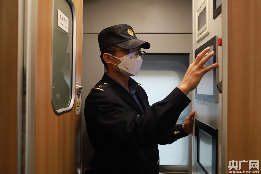 馮良良每隔2小時就會對車廂內(nèi)旅客服務設施狀態(tài)進行一次全面巡查(央廣網(wǎng)發(fā) 戴志強 攝)