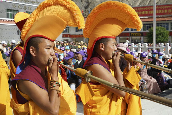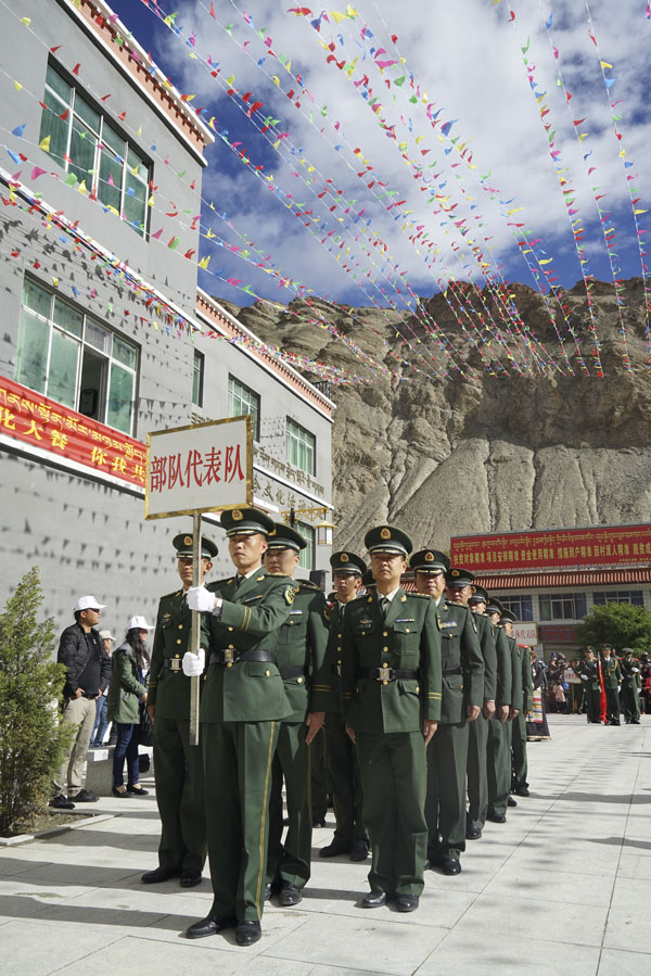 開幕式共分為五項議程。首先,來自洛扎縣各單位的8個游行方隊,共200多人,在觀眾們的歡呼喝彩聲中依次入場,順時針繞廣場一周,為開幕式預(yù)熱。其中,當(dāng)?shù)伛v軍部隊的官兵步伐整齊、英姿颯爽、口號洪亮,當(dāng)?shù)匕傩諢o一不歡呼鼓掌,也為這些平日里擔(dān)任祖國邊防重任的人民子弟兵送去節(jié)日的祝福。另外,僧尼方隊、藏戲表演隊、退休人員方隊、學(xué)生儀仗隊等方隊也都展示了各具特色的風(fēng)采,現(xiàn)場氣氛一下子被點燃。