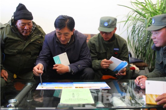 圖為那曲林業(yè)局局長(zhǎng)米瑪次仁(左二)與培訓(xùn)人員(左為嘎加達(dá)忙)交流 攝影:趙二召 今年60歲的嘎加達(dá)忙從事野保員工作已有20個(gè)年頭,多年來(lái)的保護(hù)工作讓他對(duì)野生動(dòng)物產(chǎn)生了深厚的感情,因?yàn)槟挲g原因不能繼續(xù)從事保護(hù)工作,但他已將“接力棒”傳遞給了兒子。“我兒子現(xiàn)在是羌塘國(guó)家級(jí)自然保護(hù)區(qū)管理站管護(hù)員,我時(shí)常教育他要像愛(ài)護(hù)自己的眼睛一樣保護(hù)、愛(ài)護(hù)野生動(dòng)物。” -