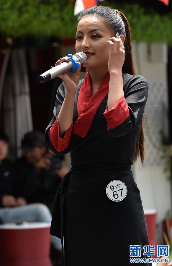 •      7月3日,一名藏族模特在展示才藝 新華社記者覺果 攝