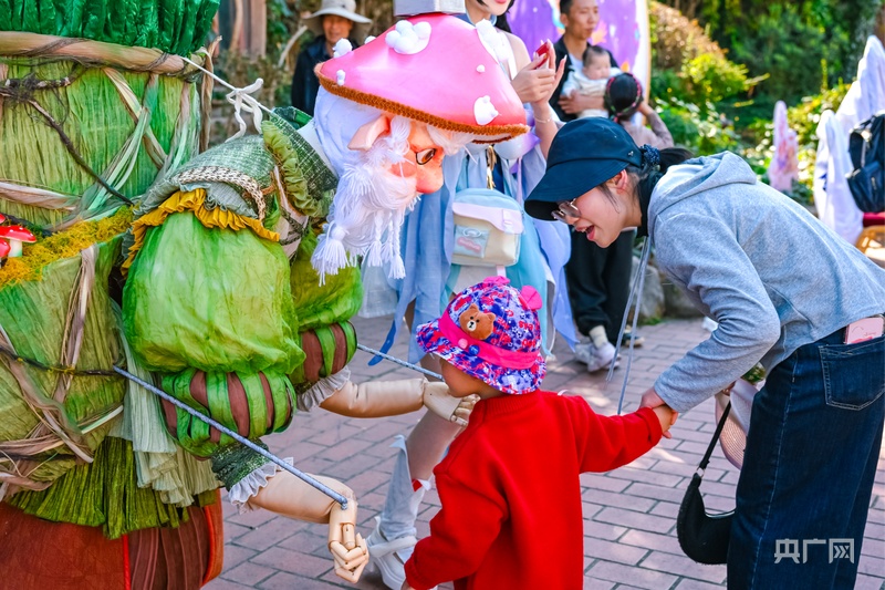 小朋友與景區(qū)內(nèi)的巡游的童話人物互動(dòng)(央廣網(wǎng)記者 趙貝貝 攝)