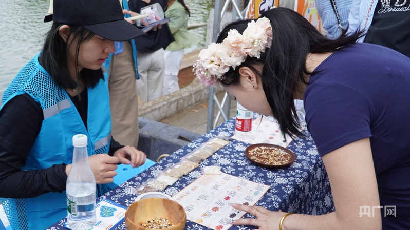 “深處種菱淺種稻,不深不淺種荷花!痹谌畹痰难嘧訕蛏希晃簧碇宕俜、手持書卷的“總督阮元”正被里三層外三層的市民圍住。這不是劇組拍戲,而是省糧食和物資儲備局帶來的“糧食安全”情景課。從兩百年前的筑堤興修水利,到現(xiàn)代“把中國人的飯碗牢牢端在自己手中”,“阮總督”幽默風(fēng)趣的互動讓糧食安全這個宏大話題變得極接地氣。不遠處的“五谷豐登”挑戰(zhàn)區(qū),游客們正忙著在谷堆里分辨“稻、黍、稷、麥、菽”。“看著簡單,真分辨出來卻不容易!庇慰徒鹣壬f。