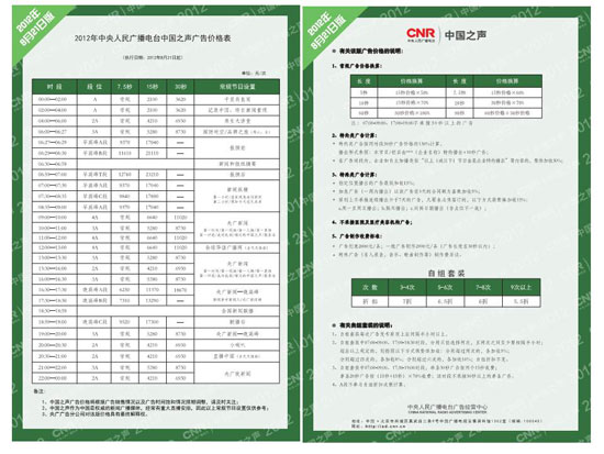 中央人民廣播電臺中國之聲、經(jīng)濟(jì)之聲廣告價格將于2012年8月21日起調(diào)整,調(diào)整后價格表已于日前正式發(fā)布。全權(quán)負(fù)責(zé)中國之聲、經(jīng)濟(jì)之聲廣告業(yè)務(wù)經(jīng)營的央廣廣告公司授權(quán)本網(wǎng)站獨(dú)家刊載,未經(jīng)授權(quán)請勿擅自刊登或轉(zhuǎn)載,否則將追究相關(guān)法律責(zé)任。