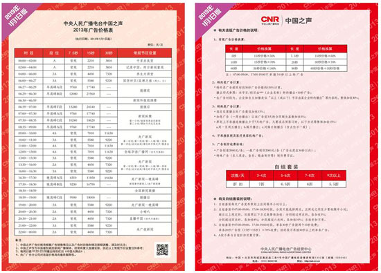 日前,2013年中央人民廣播電臺(tái)中國(guó)之聲、經(jīng)濟(jì)之聲廣告價(jià)格表正式發(fā)布,全權(quán)負(fù)責(zé)經(jīng)濟(jì)之聲廣告業(yè)務(wù)經(jīng)營(yíng)的央廣廣告公司授權(quán)本網(wǎng)站獨(dú)家刊載,未經(jīng)授權(quán)請(qǐng)勿擅自轉(zhuǎn)載。
