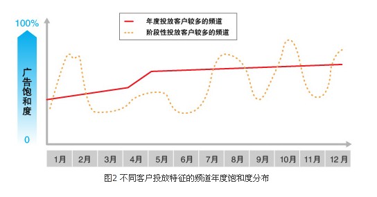 而對于年度投放合同較多的頻道,通常在年初廣告飽和度較低,進(jìn)入下半年或接近年底較高。一般年度性合同主要是在一月初到年底和四五月到年底兩種投放形態(tài)。對于年度性投放較集中的情況,則需在年初制定較低的價格,將飽和度充滿到55%以上。因?yàn)槿绻e過一月開始的全年的投放,則意味著需要將廣告空置到三月底或更遠(yuǎn)的時間,即使從四月開始將未售出的時間銷售出90%,且價格再提升50%,也僅僅是與抵消了損失,并不可能產(chǎn)生收入增量。
