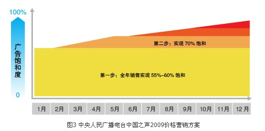 圖3顯示的是中央人民廣播電臺中國之聲2009年廣告年度價格營銷方案。該策略針對中國之聲以全年性投放客戶為主的特征,分為4個步驟操作:
