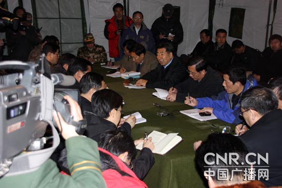 國務(wù)院副總理回良玉剛剛抵達(dá)災(zāi)區(qū)就在簡易帳篷里召開了國務(wù)院抗震救災(zāi)總指揮部會議