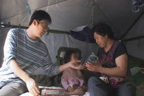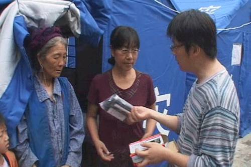 中央人民廣播電臺前方記者申玉彪向災(zāi)區(qū)群眾發(fā)放收音機(jī)