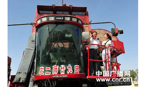 中央臺副總編輯杜嗣琨在兵團(tuán)農(nóng)二師29團(tuán)16連采棉機(jī)上作連線報道。