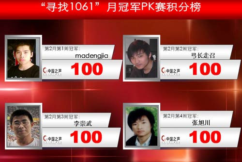“尋找1061”第二個月冠軍在5月26日22:00的《1061第二個月冠軍PK賽》中誕生。四位周冠軍張旭川、李崇武、張超、小馬激戰(zhàn)1小時30分,最后,來自四川的張旭川勝出。中國之聲、中國廣播網(wǎng)進行了全程音視頻直播。首先讓我們一睹四位周冠軍的個性亮相吧。