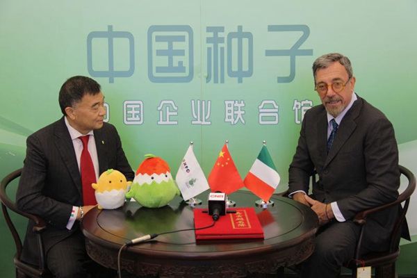 桑普多利亞足球俱樂部總經理朱塞佩·阿爾貝加尼和中國企業(yè)聯(lián)合館副館長朱裕華交談