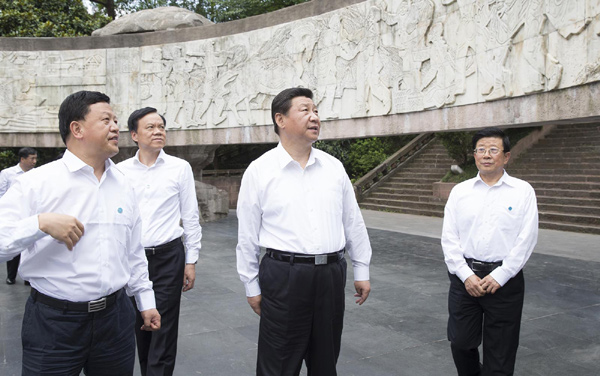 新華網(wǎng)北京6月16日電 據(jù)新華社客戶端報道,藍天白云,青松翠柏。習(xí)近平總書記16日離京來到貴州遵義考察,一下飛機就直奔紅軍山烈士陵園,向紅軍烈士紀(jì)念碑敬獻花籃。紀(jì)念碑四周的浮雕展現(xiàn)了當(dāng)年紅軍浴血奮戰(zhàn)的場景。在“突破烏江天險”浮雕前,總書記駐足感嘆:“當(dāng)時要是過不去就危險了……”碑上“紅軍烈士永垂不朽”8個字是鄧小平同志題寫的,他佇立凝望,聽取介紹。這是黨的十八大后習(xí)近平總書記第一次來黔考察。