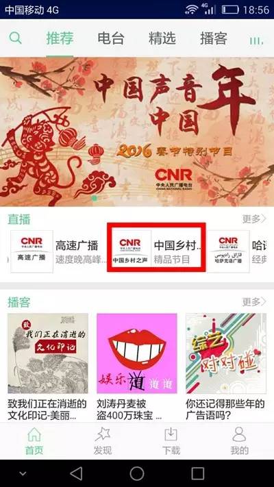 3、可到各大應(yīng)用市場(chǎng)下載“中國(guó)廣播”客戶端,在推薦頁(yè)可以找到“中國(guó)鄉(xiāng)村之聲”,點(diǎn)一下就能聽(tīng)啦!