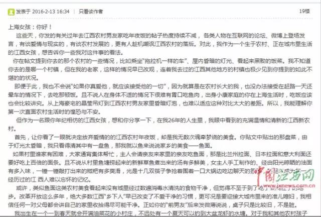 2月13日,一名自稱是在江西農(nóng)村長大的網(wǎng)友“爾雅2016”在中國江西網(wǎng)(江西手機報)的“大江論壇”發(fā)帖,給這位上海女孩寫了一封信,講述了她眼中充滿溫情和清新的江西農(nóng)村。
