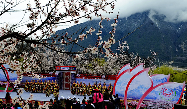 3月22日,在西藏林芝市巴宜區(qū)八一鎮(zhèn)嘎拉村,演員在桃花林小廣場(chǎng)上為游客表演。