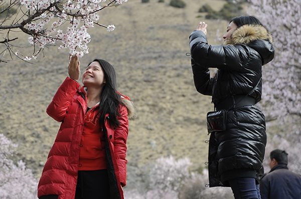 3月22日,游客在西藏林芝市巴宜區(qū)八一鎮(zhèn)嘎拉村欣賞桃花。