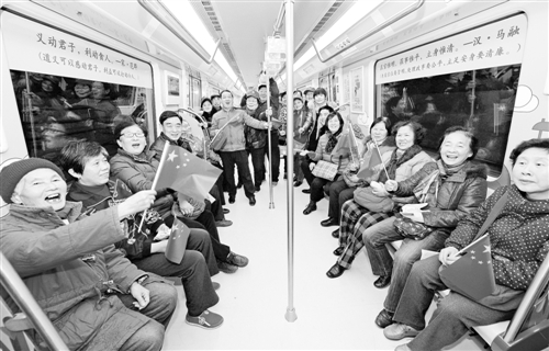 12月15日,安徽合肥軌道交通1號線列車車廂內(nèi),來自瑤海區(qū)勝利路街道一號線沿線搬遷居民在體驗軌道交通。當日,安徽首條地鐵線路——合肥軌道交通1號線啟動20萬人大型免費試乘體驗活動。這是一條縱貫合肥市南北的線路,將于12月26日正式開通運營。 張大崗攝