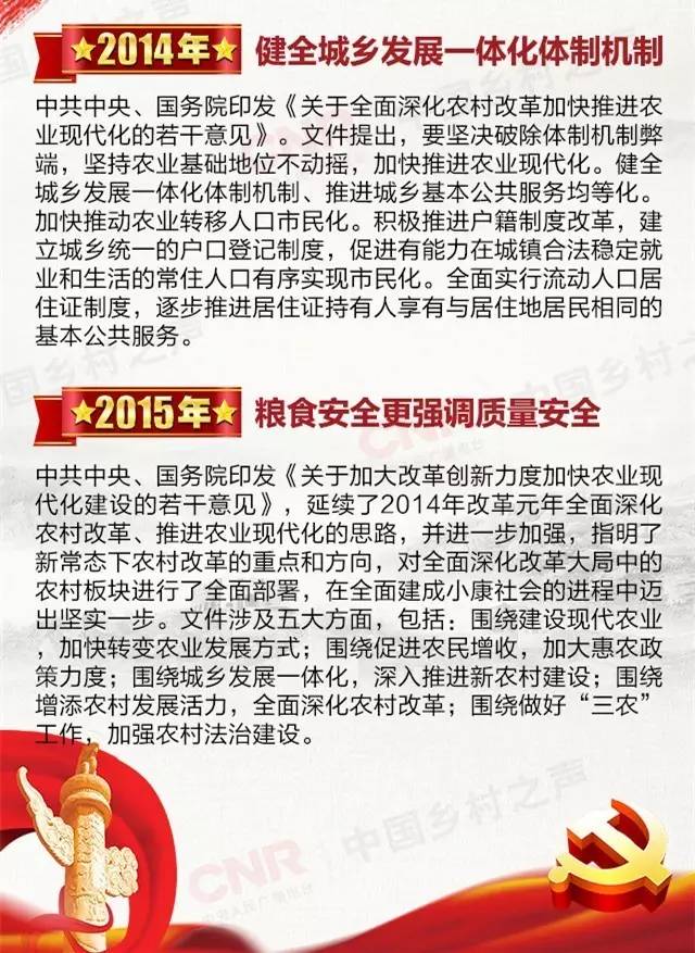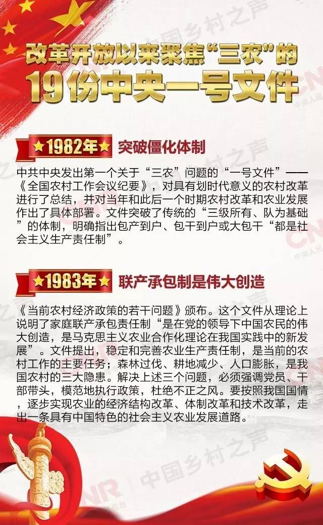 回顧改革開放以來(lái),中共中央在1982年至1986年連續(xù)五年發(fā)布以農(nóng)業(yè)、農(nóng)村和農(nóng)民為主題的中央“一號(hào)文件”,對(duì)農(nóng)村改革和農(nóng)業(yè)發(fā)展作出具體部署。時(shí)隔18年,中央一號(hào)文件于2004年再次回歸農(nóng)業(yè)。至今,中央在新世紀(jì)已出臺(tái)了14個(gè)關(guān)注“三農(nóng)”工作的中央一號(hào)文件。鑒于文件的重要作用,我們總結(jié)了十一屆三中全會(huì)以來(lái)的歷次涉農(nóng)問題的中央一號(hào)文件的主要精神,供大家回顧和參考,從中可以看出中央在農(nóng)村改革和發(fā)展方面的政策軌跡。