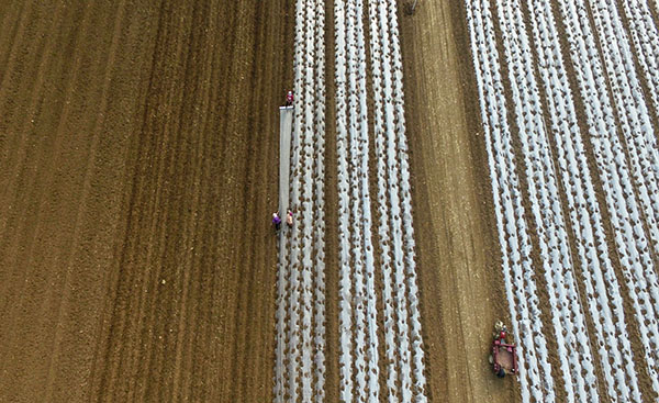 2月19日,在山東省郯城縣民樂種植農(nóng)民專業(yè)合作社種植基地,工人為種植的土豆覆膜。