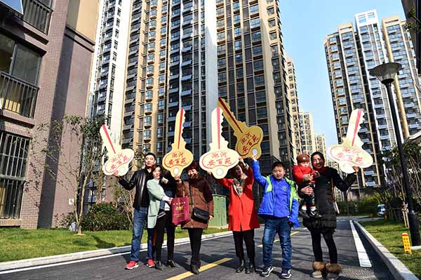 2月26日,回遷居民代表在小區(qū)里拿著“鑰匙”模型,慶;剡w。
