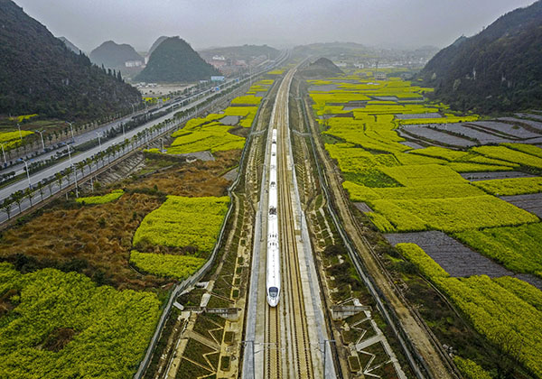 3月16日,一列動車組列車在滬昆高鐵貴州安順段行駛。
