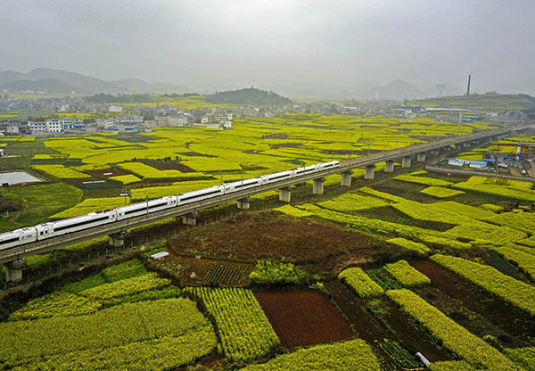 近日,貴州安順油菜花開,高鐵列車穿行其間,構(gòu)成一幅幅美麗圖畫。