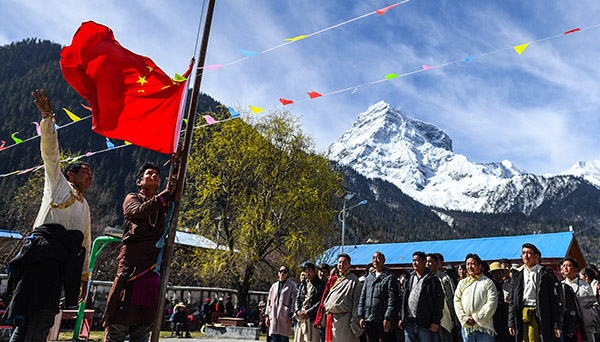 3月28日,西藏林芝市波密縣扎木鎮(zhèn)達(dá)興村村民舉行升國旗儀式,慶祝西藏百萬農(nóng)奴解放紀(jì)念日。