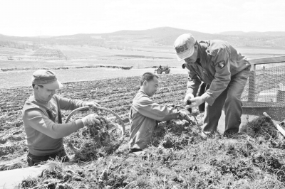 圖為在扎蘭屯市成吉思汗鎮(zhèn)馬家子村一個(gè)山坡上,扎蘭屯市煜軒中草藥種植農(nóng)民專業(yè)合作社的社員們正在播種“百畝”蒼術(shù)試驗(yàn)田。紀(jì)明國文/圖